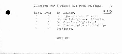 //// Jungfrun gar i ringen med röda gullband. 3 //// ^ Lekt. 1941. Sm. Kalmar. //// " " Sm. Hjorteds sn. Totebo. //// " " Sm. Hålleberga sn. Malerås. //// " " Sm. Orrefors Sigislaryd. //// " " Sm. Stenbrohylts sn. Liatorp. //// " " Stockholm. //// NORD HUS //// [ ////