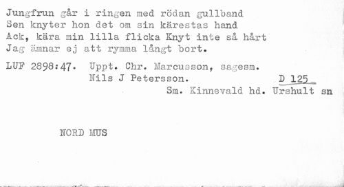//// Jungirun gar i ringen med roaan gulloand //// Sen knyter hon det om sin kårestas hand //// Ack, kära min lilla flicka Knyt inte sä hårt //// Jag ämnar ej att rymma långt bort. //// LUF 28%;47. Uppt. Chr. Narcusson, sagesm. //// Nils J Petersson. D 125 //// Sm. Kinnevald hd. Urshu.lt sn //// NORD ms ////