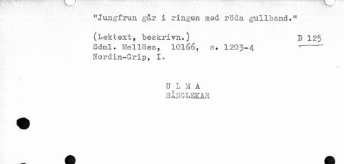 //// "Jungfrun gar i ringen med röda gullband." //// (Lektext, beskrivn.) D 125 //// Sdrnl. Mellösa, 10166, s. 1203-4 "- //// Nordin-Grip, 1. //// U L M A //// SÅI^G LEKAR ////
