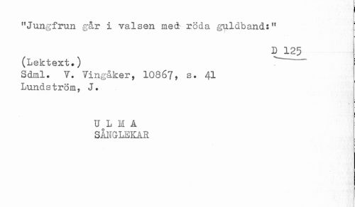 //// "Jungfrun går i valsen med röda guldband:" //// D 125 //// (Lektext.) //// Sdml. V. Vingåker, 1086?, s. 41 //// Lundström, J. //// U L M A //// SÅNGLEKAR ////