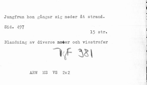 //// H //// Jungfrun hon gångar sig neder åt strand. //// Sid. 497 //// 15 str. //// Blandning av diverse noéer och visstrofer //// ARW MS VS 2:2 ////
