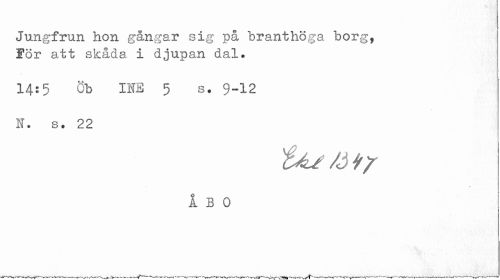 //// Jungfrun hon gångar sig på branthöga borg, //// för att skåda i djupan dal. //// 14:5 8b INE 5 s. 9-12 //// N. s. 22 //// ÅBO ////