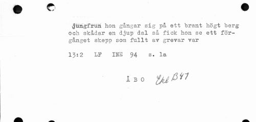 //// jungfrun hon gångar sig på ett brant högt berg //// och skådar en djup dal så fick hon se ett för- //// gånget skepp som fullt av grevar var //// 13:2 LF INE 94 s. la //// ÅBO //// A //// } //// ! ////