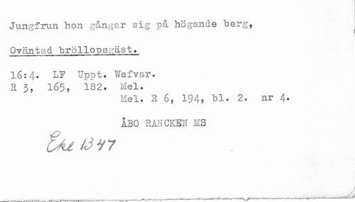 //// Jungfrun hon. gång-ar sig på högande berg, , //// ! //// Oväntad bröllopsgäst. //// 16:4. LF Uppt. V^efvar. //// R 3, 165, 182. Mel. //// Mel. R 6, 194, bl. 2. nr 4. //// ÅBO RANCKEN MS //// " n ////