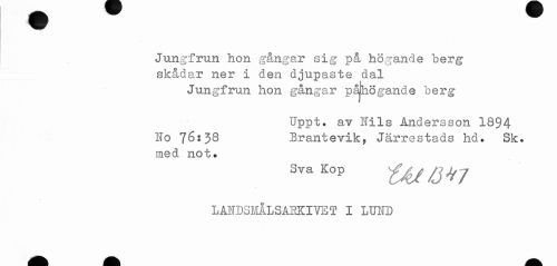 //// Jungfrun hon gångar sig på högande berg //// skådar ner i den djupaste dal //// Jungfrun hon gångar påjhögande berg //// Uppt. av Nils Andersson 18$4 //// No 76:38 Brantevik, Järrestads hd. Sk. //// med not. //// SvaKop //// LANDSMÅLSARKIVET I LUND ////