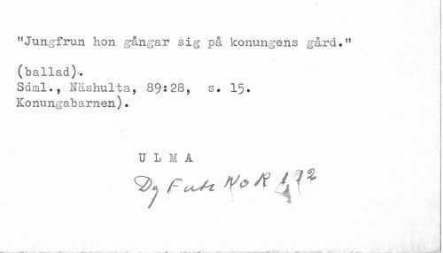 //// "Jungfrun hon gångar sig på konungens gård." //// (ballad)-. //// Sdml., Näshulta, 89:28, s. 1$. //// Konungabarnen). //// U L M A //// . ______- - . * . - ,. . y .. . .. ////