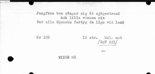 //// Jungfrun hon gångar sig åt sjögestrand //// Ack lilla vännen min //// Der alla Spanska fartyg de lågo vid land //// Nr 106 18 str. Mel. not //// /DgF 241/ //// ^ WIEDE MS ////