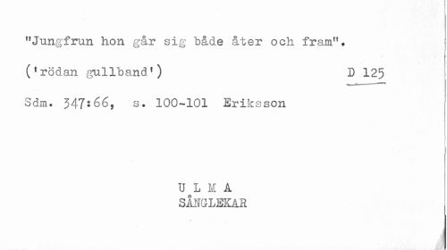 //// "Jungfrun hon g&r sig b&de åter och fram", //// ('rödan gullband') D 12$ //// Sdm. 347:66, s. 100-101 Eriksson //// ' //// U L M A //// SÅNGLEKAR ////