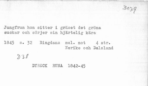 //// Jungfrun hon sitter i gräset det gröna //// suckar och sörjer sin hjärtelig kära //// - - - gn //// 1845 s. 32 Ringdans mel. not 4 str. //// Nerike och Dalsland //// DYBECK RUNA 1842-45 ////
