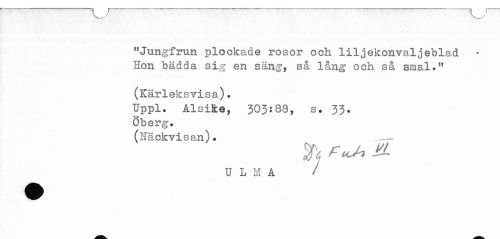 //// "Jungfrun plockade rosor och liljekonvaljeblad //// Hon bädda sig en säng, så lång och så smal." //// (Kärleksvisa). //// Uppl. AlsiRe, 303:88, s. 33. //// Öberg. //// (Näckvisan). .- //// U L M A / ////