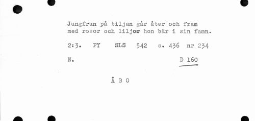 //// Jungfrun p& tiljan går åter och fram //// med rosor och liljor hon bär i sin famn. //// 2:3. PY SLS 542 s. 436 nr 234 //// N. D 160 //// ÅBO ////