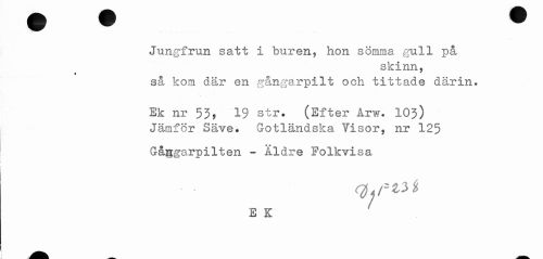 //// Jungfrun satt i buren, hon sömma gull på //// skinn, //// så kom där en gångarpilt och tittade därin. //// Ek nr 53, 19 str. (Efter Arw. 103) //// Jämför Säve. Gotländska Visor, nr 125 //// Gåggarpilten - Äldre Folkvisa //// j //// 1 //// E K ^ //// _ ////