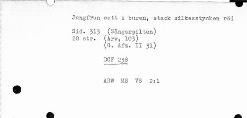 //// Jungfrun satt 1 buren, stack silkesstycken röd //// Sid. 313 (S&ngarpilten) //// 20 str. (Arw, 103) //// (G. Afz. II 31) //// DGF 238 //// ARW NS VS 2:1 //// 1 //// ! ////