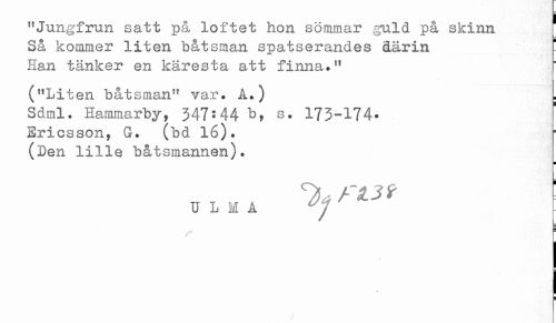 //// "Jungfrun satt på löftet hon sömmar guld på skinn //// Så kommer liten båtsman spatserandes åårin //// Han tänker en käresta att finna." //// ("Liten båtsman" var. A.) = //// Sdml. Hammarby, 347:44 b, s. 173-174* //// Ericsson, G. (bd 16). //// (Den lille båtsmannen). //// H //// U L M A ' / ////