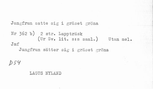 //// ' //// Jungfrun satte sig i gråset gröna //// Nr 362 b) 2 str. Lappträsk //// (Ur Sv. lit. s:s saml.) Utan mel. //// Jmf //// Jungfrun sätter sig i gräset gröna //// LAGUS NYLAND ////