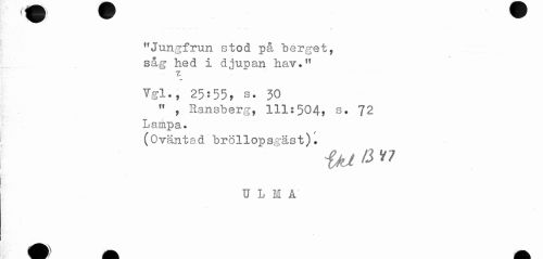 //// ^ - . ^ //// ' * * - . - - . -t //// "Jungfrun stod på berget, //// såg hed i djupan hav." //// Vgl., 25:55, s. 30 //// " , Ransberg, 111:504, s. 72 //// Lampa. //// (Oväntad bröllopsgäst). //// U L M A ////