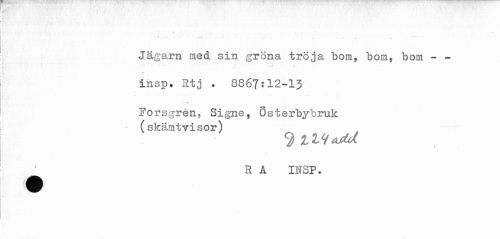 //// ! * t //// -'-t - .. ' ,. - . ... .... ' . ^ . . , //// Jägarn med sin gröna tröja bom, bom, bom - - //// insp. Rtj . 8867:12-13 //// Forsgrén^ Signe, Osterbybruk //// - (skämtvisor) //// R A INSP. ////