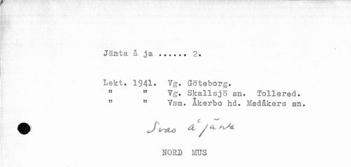 //// Jänta & ja...... 2. //// Lekt. 1941. Vg. Göteborg. //// " " Vg. Skallsjö sn. Tollered. //// " " Vsm. Åkerbo hd. Hedåkers sn. //// NORD ms ////