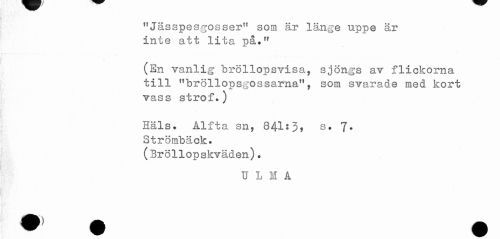 //// "Jässpesgosser" som är länge nppe är //// inte att lita på." //// (En vanlig bröllopsvisa, sjöngs av flickorna //// till "bröllopsgossarna", som svarade med kort //// vass strof.) //// Häls. Alfta sn, 841:3, s. 7. //// Strömbäck. //// (Bröllopskväden). //// U L M A ////