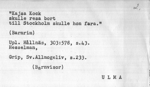 //// "Kajsa Kock //// skulle resa bort //// till Stockholm skulle hon fara." //// (Barnrim) //// * * //// Upl. Hållnäs, 303:573, s.43. //// Hesselman, //// * ^ -. -. //// Grip, Sv.Allmogeliv, s.233. //// (Barnvisor) //// r //// i ////