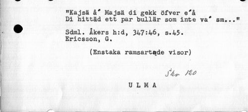 //// "Kajsä å* Majsä di gekk öfver e*å //// Di hittäd ett par bullar som inte va* sm..." //// ^ Sdml. Åkers h:d, 347:46, s.45. //// Ericsson, G. //// ! (Enstaka ramsartqde visor) //// U L M A ////