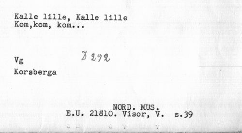//// Kalle lille, Kalle lille //// Kom,kom, kom... //// i //// vg 2 a?%, //// Korsberga //// ^ NORD. MUS. //// E.U. 21310. Visor, V. s.39 //// - //// * //// - - ////