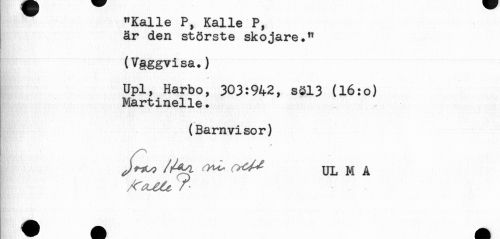 //// "Kalle P, Kalle P, //// är den störste skojare." //// (Vaggvisa.) //// Upl, Harbo, 303:942, söl3 (16:o) //// Martinelle. //// (Barnvisor) //// <** //// J^? ^ UL M A ////