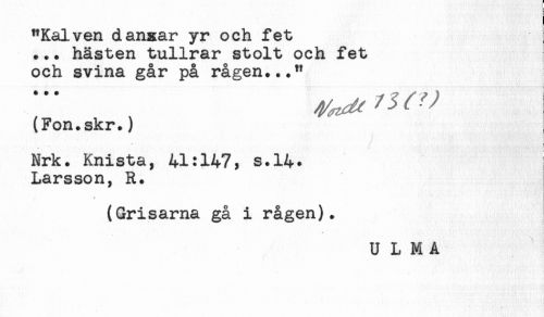 //// [ //// "Kalven dansar yr och fet //// +.. hästen tullrar stolt och fet //// och svina går på rågen..." //// (Fon.skr.) //// t //// Nrk. Knista, 41:147, s.14* //// Larsson, R. //// (Grisarna gå i rågen). ////