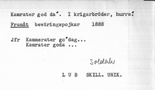//// j //// Kamrater god da*\ I krigarbröder, hurraf //// Framåt beväringspojkar //// Jfr Kammerater goddag... //// Kamrater goda ... //// L U B SKILL. UNIK. //// " . * ////