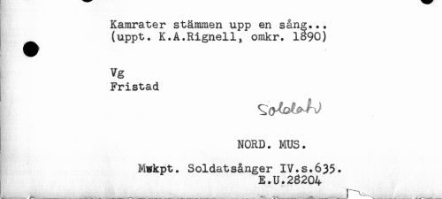 //// Kamrater stämmen upp en sån^... //// (uppt. K.A.Rignell, omkr. 1890) //// vg //// Fristad //// NORD. MUS. //// Mwkpt. Soldatsånger IV.s.635. //// E.U.23204 ////