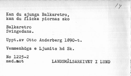 //// Kan du sjunga Balkaretro, //// kan du flicka piornas sko //// ' . ' ' ... . } //// Balkaretro //// Svingedans. //// - //// Uppt.av Otto Anderberg 1390-t. //// Vemmenhögs e Ljunits hd Sk. //// No 1225-2 //// med.mot LANDSMÅLSARKIVET I LUND i //// ! //// t //// < //// ! ////