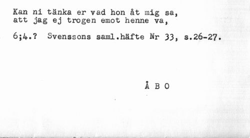 //// Kan ni tänka er vad hon åt mig sa, //// att jag ej trogen emot henne va, //// 6;4.? Svenssons saml.häfte Nr 33* s.26-2?. //// ÅBO ////