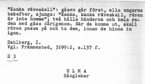 //// "Kanka räveskall": gåsen går först, alla ungarna //// bakefter, sjunga: "Kanka, kanka råveskall, räven //// är inte hemma"; två hålla händerna och hela ra- //// den med gäss därigenom. När de komma ut, skall //// räven passa på och ta dem, innan de hinna in //// igen. //// Dahlberg, 1. //// Vgl. Främmestad, 3299:2, s.157 f. //// D 3_ //// U L M A //// Sånglekar ////