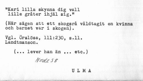 //// "Kari lilla skynna dig vall //// lille gråter ihjäl sig." //// (Här sägen att ett skogsrå våldtagit en kvinna //// och barnet var i skogen). //// Vgl. Örslösa, 111:230, s.ll. //// Landtmanson. //// (... lever han än ... etc.) //// /^f JV //// < ////