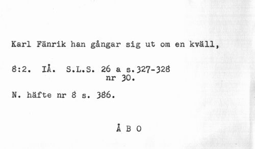 //// Karl Fänrik han gångar sig ut om en kväll, //// 6:2. IÅ. S.L.S. 26 a s.327-328 //// nr 30. //// N. häfte nr 8 s. 386. ////