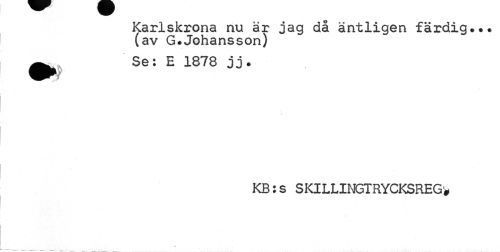 //// Karlskrona nu är jag då äntligen färdig... //// (av G.Johansson) //// ^ Se: E 1878 jj. //// i //// KB:s S KlLLINGTRYCKSREG, //// t- _______.____ ////