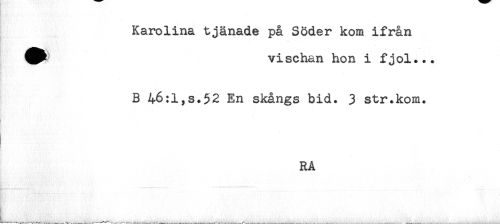 //// - //// Karolina tjänade på Söder kom ifrån //// ^^ vischan hon i fjol... //// B 46:1,s.52 En skångs bid. 3 str.kom. //// RA ////