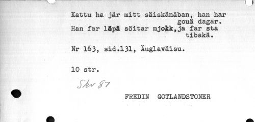 //// Kattu ha jär mitt säiskänäban, han har //// gouä dagar. //// Han far läpå söitar mjokk,ja far sta //// tibakä. //// Nr 163, sid.131, Äuglavåisu. //// * **' //// 10 str. //// ^ FREDIN GOTLANDSTONER //// " + - " + ////