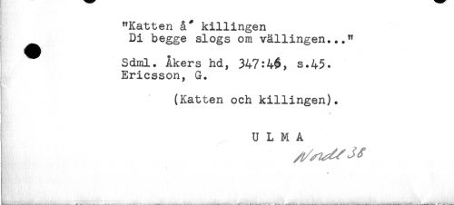 //// ! "Katten å* killingen //// Di begge slogs om vällingen..." //// ^ Sdml. Åkers hd, 347:4$, s.45. //// Ericsson, G. //// (Katten och killingen). //// s -** //// U L M A ////