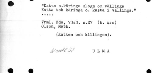 //// " "Katta o.käringa slogs om vällinga //// Katta tok käringa o. kasta i vällinga." //// + + + + + //// Vrml. Eda, 7343, s.27 (h. 4:o) //// Olson, Math. //// (Katten och killingen). //// * //// ^ U L M A //// * ////