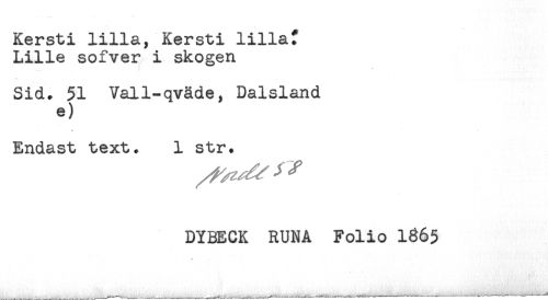 //// Kersti lilla, Kersti lilla? //// Lille sofver i skogen //// Sid. 51 Vall-qväde, Dalsland //// e) //// Endast text. 1 str. //// DYBECK RUNA Folio 1865 ////