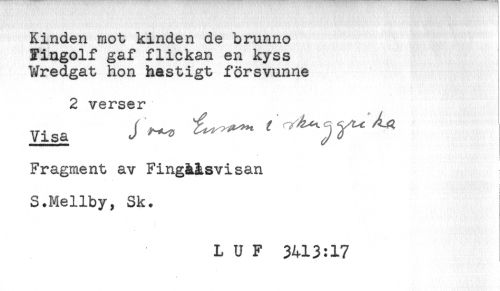 //// Kinden mot kinden de brunno //// Tingolf gaf flickan en kyss //// Wredgat hon hastigt försvunne //// 2 verser //// Visa J ^ ^ ^ //// Fragment av Fingåäsvisan //// S.Mellby, Sk. //// L U F 3413:17 ////