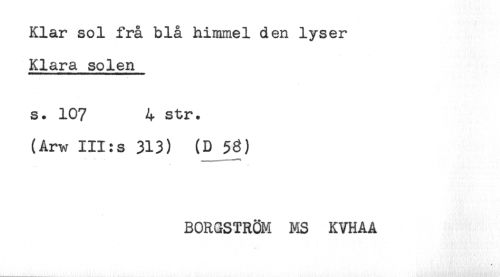 //// Klar sol frå blå himmel den lyser //// Klara solen //// s. 107 4 str. //// (Arw III:s 313) (D 53) //// BORGSTRÖM MS KVHAA //// - ////