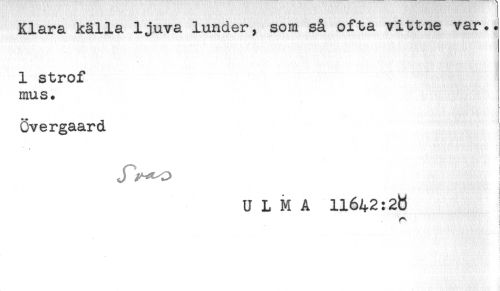 //// Klara källa ljuva lunder, som så ofta vittne var.. //// 1 strof //// mus. //// Övergaard //// Jl^O //// U L M A 11642:20 //// * //// r //// i ////