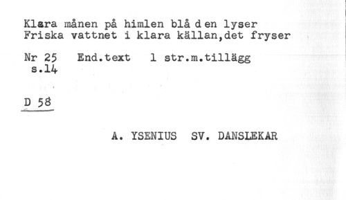 //// Klara månen på himlen blå d en lyser ! //// Friska vattnet i klara källan,det fryser //// Nr 25 End.text 1 str.m.tillägg //// s.14 //// D 5g //// A. YSENIUS SV. DANSLEKAR ////