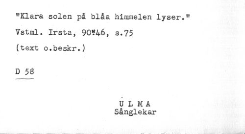 //// "Klara solen på blåa himmelen lyser." //// Vstml. Irsta, 90Y46, s.75 //// (text o.beskr.) //// D 53 //// U L M A //// Sånglekar ////