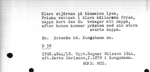 //// ^ ' 3 //// R ! //// Klara stjärnan på himmelen lysa, //// Friska vattnet i klara källarena frysa, //// nappa bort den du behagar att nappa, //// efter honom kommer prästen med sin stora //// svarta kappa. //// Bo. Sotenäs hd. Kungshamn sn. //// D 58 //// - - ^ //// ^ IFGH.4944/13. Uppt.Ragnar Nilsson 1944, //// ^ eft.Berta Carlsson,f.1373 i Kungshamn. //// NCRD. MUS. ////