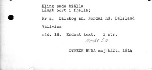 //// ! Kling sade biälla //// Långt bort i fjella; //// Nr Dalskog sn. Nordal hd. Dalsland //// Vallvisa //// sid. 18. Endast text. 1 str. //// ' S ' //// DYBECK RUNA maj-häft. 1^44 ////