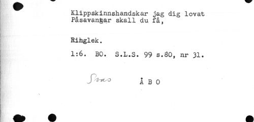 //// Klippskinnshandskar jag dig lovat //// Påsavangar skall du få, //// Rihglek. //// 1:6. BO. S.L.S. 99 s.30, nr 31. //// ^ B 0 ////