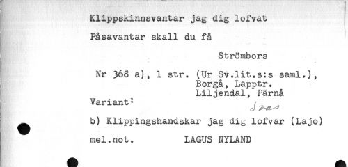//// i Klippskinnsvantar jag dig lofvat //// Påsavantar skall du få //// Strömbors //// * * //// Nr 368 a), 1 str. (Ur Sv.lit.s:s saml.), //// Borgå, Lapptr. //// Liljendal, Pärnå //// Variant * //// ^ b) Klippingshandskar jag dig lofvar (Lajo) //// mel.not. LAGUS NYLAND ////